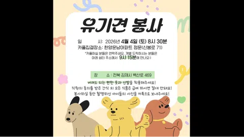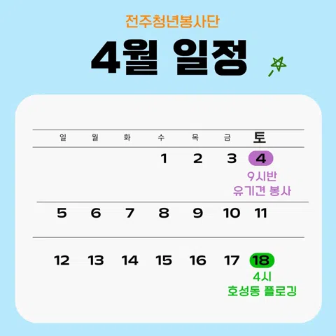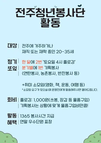 플로깅, 농촌봉사, 반찬봉사 등 봉사활동으로 신나고 뿌듯한 시간을 함께 보낼 사람? 여기여기 모여라-! ✨<전주청년봉사단>은 사회와 소외계층을 잇고 청년과 청년을 잇는 전주 청년 봉사 커뮤니티입니다. ⭐️함께 봉사활동 할 단원 모집 중⭐️ 🙋🏻♀️봉사로 의미있는 시간을 보내고 싶은 청년 🙋🏻♂️동네 청년들과 친해지고 싶은 청년 🙋🏻이 글을 보고 있는 당신! 함께해요:-) ------------------------------------- 🩵대상: -전주에 거주 중인 20세 ~ 35세 (2026년 기준 07년생 ~ 92년생) 🩵정기 모임 -한 달에 2번 '토요일 4시 플로깅' -분기별 1번 기획봉사 +⚡️번개 소모임(친목, 취미 등) 🩵회비 -플로깅: 1,000원(물품구입) -기획봉사는 상황에 맞게 물품구입비만큼 🩵활동혜택 -1365 봉사시간 지급 -연말 우수단원표창 🩵소통 -정모에 참가한 단원분들은 카톡단톡방에 초대합니다