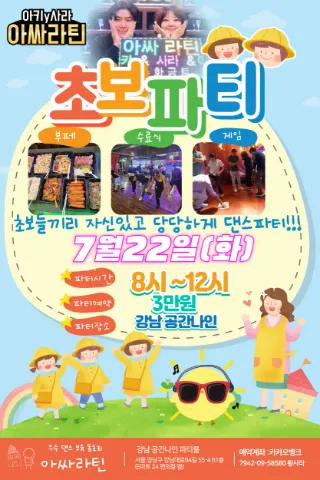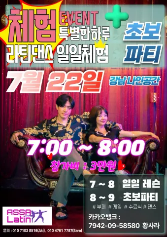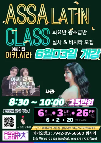 코리아 챔피언 출신의 강사진과 20년이상의 레슨경력 90명 이상의 회원들이 즐겁게 살사댄스, 바차타댄스를 배우고 있습니다. 저희와 함께, 살사, 바차타, 방송댄스를 즐기고 싶으신분들은 톡방에 언제든지 남겨주시고 자기소개 간단히 남겨주심 톡으로 연락드립니다. 20 30 40 50언제든지 가입환영해드립니다. 1. 커플댄스를 처음 접해보시는분~! 2. 새로운 멋진 인연을 만들고 싶으신분들 3. 식상한 다이어트말고 즐겁게 춤추시면서 다이어트하실분들~ 4. 몸치 박치라도 상관없어요~ 자기의 새로운 면을 발견하시고 싶으신분들~ ASSA LATIN(아싸 라틴!) 으로 오세요~ 카톡 : fdive99 3,4월 레슨스케줄 매주 화요일 토요일에 있습니다. 자세한 내용은 "레슨일정 게시판"에서 확인하시면 됩니다. 준비사항 - 움직이기 편한 복장과 가벼운 댄스화 또는 운동화를 따로 준비해주세요. - 담배피시는분들은 수업전 가글이나 불쾌한 냄새가 나지않게 준비해주세요~ - 댄스를 배우고픈 열정!!! 만 가지고 오심됩니다.