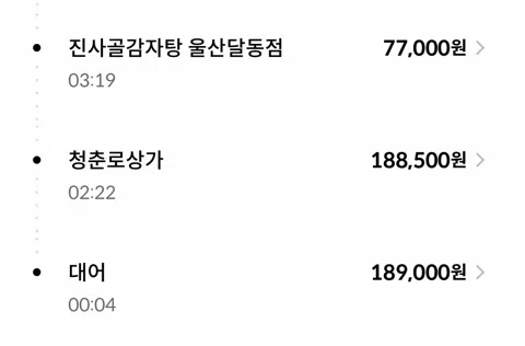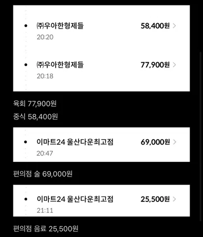 파티룸 270,000원 육회 77,900원 중식 58,400원 편의점 술 69,000원 편의점 음료 25,500원 피자 49,900원 편의점 맥주 28,300원 치킨 43,000원 편의점 18,