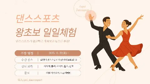✨ 2040 댄스스포츠 동호회 어펠, 신입모집중! 나이도, 전공도, 지역도 다양한 사람들이 댄스스포츠라는 관심사로 모여 건강한 취미생활을 함께 하고 있어요! 춤이 낯선 초보자도 기본기부터 🕺💃 전/현직 프로 선수 선생님의 전문적인 수업을 들을 수 있어요! - 어펠 베이직반 1주차 맛보기 체험 가능 🌱 - 댄스스포츠 왕초보 일일체험 가능🌱 - 매주 양재 토요수업 & 신대방 수요정모 - 매 학기 신입생 환영회, 종강발표 - 네이버 공식 카페에 수업 영상 업로드 어펠에서 춤의 기초와 댄스인의 예절부터 탄탄하게~ 신입생 혜택과 멘토링 기회를 놓치지 마세요!