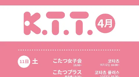 ●코타츠 속 온기와 같은 대화의 따뜻함이 있는 곳 kotatsu 로 들어오세요 ●저희 코타츠는 한국인 여성 & 일본인 여성만 참여 가능한 공간입니다 ●하나의 코타츠(테이블)에 🇰🇷 & 🇯🇵 2 & 2 비율을 지향합니다 ●☕️카페에서 (1차) - 2시간 동안 (₩5000) 🎲1시간 후 자리 교체 ✅️가입조건 •한일 여성분 •20~30대 만 가입 받고있어요🙏 🚫금지사항 (강제탈퇴 사유) •무단불참 •취소가 반복되는 경우 •유령회원 •대화 분위기를 망치시는분 •종교활동 •다른 모임 운영진 or 스텝 📷코타츠 인스타 : @kotatsu_kj