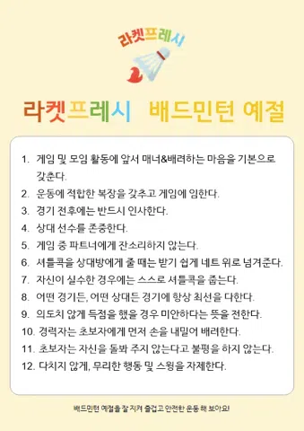 실력 향상 목표! 배드민턴 소모임 라켓프레시 환영합니다🙇🏻♀️ 🌟가입 조건🌟 -나이 : 06~90년생 -구력/급수 동호회/클럽 활동 여자 1년, 남자 2년 이상 게임 룰 숙지 필수 * 배드민턴 ⭕️ 만남(만) 목적 ❌ ❕가입 방법❓ -자기소개서 작성 > 개별 연락 > 맛보기 참여(정모/번개) > 오픈톡방 입장 및 회비(1,000원) 입금 -신규 회원 2주 이내 미참 시 강퇴 ❕정모⏱️ -월, 수 저녁 7시 30분~9시 50분, 송내사회체육관 -토 저녁 6시 30분~9시 30분, 서촌다목적체육관 ❕출석🙌🏻 -가입 후 2주 이내, 1달에 2번 이상 필수 참석 * 정모, 번개 상관 X * 'Team.RaF'로 대회 참석 인증 시 1회 -‘사유 없이’ 당일 불참 경고, 2회 경고 없이 강퇴(회비 환불 불가) ❕준비물‼️ -개인 라켓, 전용 배드민턴화, 깃털 셔틀콕 -공용콕 : 보본 365, 강산연 블랙, 삼화 더블랙, 삼화 900+, KBB 79,