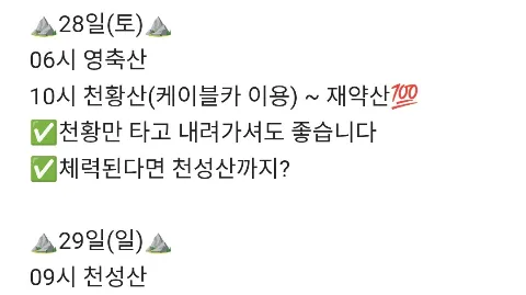 🍀3월 일정🍀 25(수) 클라이밍🧗 28(토) 북한산13성문 28(토) 북악산 플로깅 28(토)-29(일) 영축,천황,재약,천성,금정산(1박2일 🌸4월 일정🌸 01(수) 곱창&곱창전골벙 02(목) 1주차 러닝프로그램🏃♀️🏃 옥수역 04(토) 가지산💯 / 불수사도북🫵 04(토) 덕룡💯-주작(다음메일산악회 버스) 09(목) 2주차 러닝프로그램🏃♀️🏃 월드컵경기장역 11(토) 🌸천주산 정기산행(산행지변경가능성있음) 16(목) 3주차 러닝프로그램🏃♀️🏃 용답역 18(토) 19(일) 조계산,팔영산,천관산💯(1박2일) 18(토) 백운산,태화산💯💯 23(목) 4주차 러닝프로그램🏃♀️🏃 여의나루역 25(토)-26(일) 낙산사 템플스테이[울산바위]🙏 25(토)-26(일) 대신캠핑장🏕 30(목) 5주차 러닝프로그램🏃♀️🏃 충무로역 ⚠️ 가입조건⚠️ - 82년생 이하 - 기혼, 등산 운영진 불가❌️ - 가입후 3개월이상 미참석시 강퇴🚷