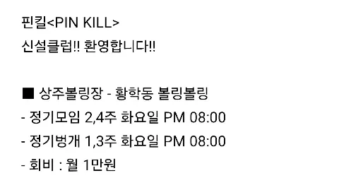 핀킬<PIN KILL> 신설클럽!! 환영합니다!! ■ 상주볼링장 - 황학동 볼링볼링 - 정기모임 2,4주 화요일 PM 08:00 - 정기벙개 1,3주 화요일 PM 08:00 - 회비 : 월 1만원 ■ 가입조건 - 나이 79년이하 (빠른 X, (지인추천 나이제한 없음) - 초보/실력자 상관없이 환영 - 남자 : 기본장비 필수!! (가입후 장비구입예정이면 가입가능) - 여자 : 장비없어도 열정과 관심 필수!! - 가입 후 30일간 무단불참 강퇴!! - 가입 후 24시간내 자소서미작성시 강퇴!! - 유령회원/무단불참 강퇴!! - 신입회원은 2회이상 참석 후 정회원 유무 판단 ※타클럽 모임장 가입 및 활동불가 ※볼링장내(볼링볼링)타클럽 중복가입X ※뒷풀이 참석강요X 희망자