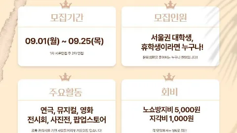 🎭 문화생활 연합동아리 "필름로그(F-log)" ✨ “당신의 대학생활에 새로운 필름로그(F-log)을 더하다.” 안녕하세요:) 문화생활을 사랑하는 대학생들이 모여 영화 🎬, 전시회 🖼, 뮤지컬·연극 🎶 등 다양한 문화생활을 함께 즐기는 대학생 연합 동아리 "필름로그(F-log)"입니다. 각자의 대학 생활 속에서 하나의 추억으로 남을 특별한 경험을 함께 만들어가요! 전시회나 공연, 영화를 보러 가기도 하고 각자 보고 싶은 콘텐츠에 맞춰 자유롭게 ⚡️번개 모임도 열 수 있습니다. 👉 그동안 함께한 활동 • 그라운드시소 전시회 • 국립현대미술관 • 하이커 그라운드 • 페레스 프로젝트 • 혜화동 연극 • 다양한 뮤지컬 관람 • LP바 번개 📌 모집: 상시 진행 중! 1차 전화 면접 → 합격자에 한해 대면 OT 진행, 개별 안내 (미합격자는 별도 연락 없음) 모집인원 - 서울권 대학생 및 휴학생이라면 누구나! - 문화생활을 좋아하고 새로운 사람들과 즐기고 싶은 분 💰 회비: 노쇼 방지비 5,000원 / 지각비 1,000원 → 각 모임은 1/N 정산, 번개 지원 및 MT 등에 사용 → 사용 내역은 투명하게 공개됩니다 ⚠️ 본 동아리는 대학생들에 의해 자치적으로 운영되며, 정치·종교·시민단체와 무관함을