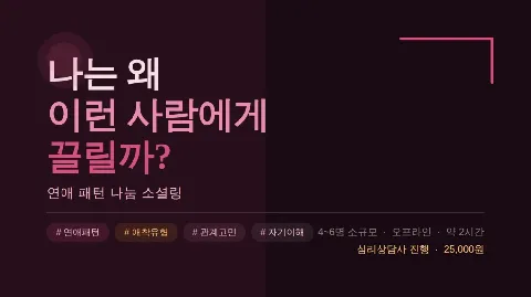 👐 우리 클럽을 소개해요. 심리를 알고싶고 대화를 좋아하고 다양한 주제에 대한 탐구를 즐기는 분들을 환영해요!! 👟 클럽은 이렇게 활동할 거예요. ✔️ 감정탐구🔎인간의 많은 감정 : 주 1,2회 온라인/오프라인 ✔️ 심리 북토크: 매 달 2권을 정해서 읽고 대화해요 : 2주 마다 1,2회 온라인 / 오프라인 ✔️ 연애 탐구 1~3탄 : 연애 전 나를 알기(온라인/오프라인) /나와 어울리는 사람 만날 준비하기(온라인/오프라인)/ 3:3 만남으로 연애세포 깨우기 : 1개월 1,2회 오프라인 ✔️ 라이프 컨설팅 : 버킷리스트, 동기부여, 건강한 삶 꾸리기 ✔️ 집단 심리상담 : 전문가와 함께하는 다양한 집단상담 :대인관계/ 미술치료/ 가족문제/ 자아성장등등 ✔️ 미술&제작 프로그램 : 명화그리기, 캔들, 향수, 니팅등등 ✔️ 외부 프로그램 : 전시회, 영화, 뮤지컬관람 맛집-카페 탐방등등 ✔️ 기타 : 원하는 프로그램 남겨주시면 적극 반영 합니다. 🙆♀️ 이런 멤버와 함께 하고 싶어요. 서로를 배려하고 모임에 적극적으로 참여하는 멤버를 원해요! 🎲 우리 클럽은 이런 규칙을 따라요. 매너있는 대화를 나눠요! 매너와 예의를 갖춘 성인들의 공간이예요! 모임에 한 달에 한 번 이상은 참여해 주세요.
