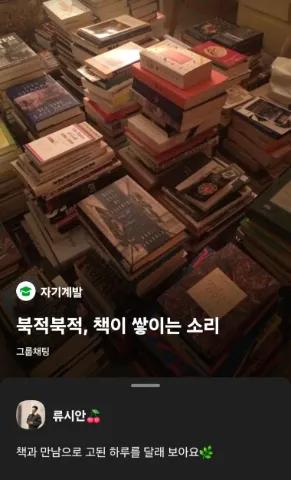 책 읽기, 글 쓰기로 마음 정돈을 해 보아요☘️ 영어로 책을 말하는 [BOOK] 그리고 쌓다는 뜻의 한문 [積] 두 단어가 만나 책이 쌓이는 소리 "북적북적"이 되었답니다👏👏 책을 가지런히 쌓아 올리는 것처럼 마음을 차곡히 정돈하는 시간을 가지려고 해요 ! 한 잔의 "위스키"가 주는 나른함과 함께 여럿이 책 읽으실 분 환영합니다. * 음주를 못하는 분들은 논알콜 음료를 드려요. ▪︎정기모임 수 또는 목 또는 금 ✔️19:30 - 21:00 책 읽기&쓰기 ✔️21:00 - 22:00 간단한 얘기 나누기 ▪︎주요내용 - 읽고 쓰기에 집중하려고 해요. 말하기의 부담을 덜어 내려고 합니다. - 보통 자유독서로 진행되며, 월 1회 지정 도서로 진행합니다. 알아주세요🙋♂️🙋♂️ - 2030 모임입니다. 만 나이로 가입해주세요. - 자유로운 독서 분위기를 지향해요. - 기본적인 매너는 지켜주세요.