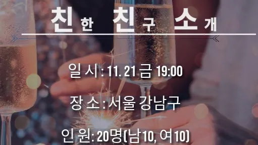 ✨️ 11월 둘째주 현재 32명 (♂️남 16명 ♀️여 16명) ✨️ 신원, 외모 확실한 사교모임✨️ 신입환영 ✨️ 추천제로 운영하던 사교 모임으로 어플 상 인원과 차이가 있어요 ♦️ 가입심사 있습니다. 자소서 꼭 남겨주세요! ♦️ 텃세 ❌️ 과한 규제 ❌️ ↘️ 성숙하고 편안한 분위기의사교 모임 ↙️ ▪️ 연령제한: 99년생 ~ 86년생까지 ▪️ 주활동지: 강남, 신사, 압구정, 이태원, 잠실 ▪️매주 크고 작은 모임, 매달 대정모, 및 파티 기획 ✔️ 와인 위스키 모임 정기 개최 ✔️ 캠핑, 수상 레포츠 등 취미공유 ✔️ 심심할때 동네 간술 공무원, 의사, 변호사, 대기업, 사업가, 디자이너 등 다양한 직업, 다양한 사람들과 어울려 보세요 🔽🔽🔽🔽🔽🔽🔽🔽🔽🔽🔽🔽🔽🔽