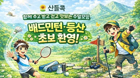 🌻 산들콕 산들바람처럼 가볍게, 즐겁게 걷고, 배드민턴 즐기는 주말모임 “실력보다 분위기, 초보 배드민턴 산책” * 가입 조건 * 배드민턴 준비물 - 라켓 (대여 가능) - 배드민턴화 (인도화) - 셔틀콕 삼화블랙 2개 * 일정 - 일시 : 토요일 10시 - 장소 : 파주시배드민턴전용구장( 경기 파주시 아리랑로 55-81)
