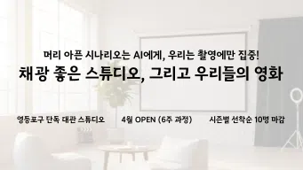 30평 단독홀을 통째로 빌려, 현직 배우와 함께 ‘나만의 단편 영화’를 남기는 힐링 프로젝트:) ✨ 차원이 다른 쾌적함 • 5시간 단독 대관: 모임은 2시간 반, 앞뒤 시간은 영화 관람이나 수다 등 자유로운 아지트로 활용하세요. • AI 대본 생성: 시나리오 고민은 NO! 모임장 특허 AI가 당신의 아이디어를 순식간에 대본으로 만듭니다. • 부담 없는 참여: 배우가 되어도 좋고, 연출 디렉터로 참여해도 좋습니다. • 현직 배우 메이트: 가르치는 레슨이 아닌, 함께 즐겁게 놀 ‘현직자 친구’가 가이드라인을 잡아줍니다. 🗓️ 6주간의 여정 1. 아지트 입성 & AI 대본 초안 만들기 2. 커피 한 잔과 함께하는 대본 리딩 3. 대형 스크린 앵글 공부 및 콘티 작업 4. 스튜디오 리허설 (아이폰 프로 활용) 5. [Main] 우리만의 단편 영화 촬영 DAY 6. 완성본 감상 및 힐링 상영회 💰 참여비 안내 스튜디오 단독 이용(6주간, 총 6회), 장비 및 스크린 옵션 대여, 다과비가 포함된 금액입니다. • 인원: 6~10명 (선착순 마감) • 장소: 영등포구 단독 스튜디오 "배우러 오지 마세요. 우리와 함께 '영화'라는 놀이를 즐기러 오세요!"