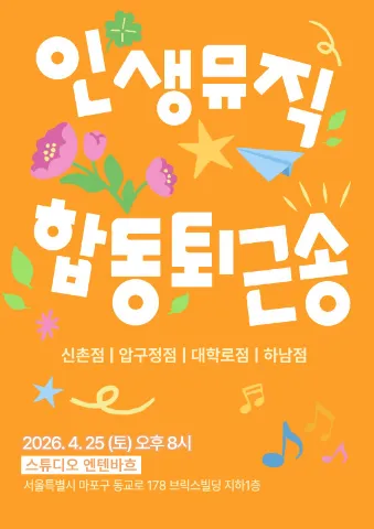 모이면 그날은 바로 음악파티-!! 소공연 / 파티 / 합주 / 모임을 즐기는 곳! 보컬🎤 기타🎸 피아노🎹 드럼🥁 작곡💻 당신의 일상이 특별하고 행복하길! 함께 할 음악 커뮤니티 인생뮤직🧡 편안하고 넓은 라운지에서 다양한 사람들과 소통하며 행복한 시간보내세요! 매달 진행하는 정기공연 '퇴근송'에 관객으로 무대위 주인공으로 참여해보세요💚 인생뮤직 압구정점은 압구정역 4번 출구 도보 3준거리에 있습니다😊 ⭐️처음 오시는분들껜 무료로 음악 레슨 해드립니다⭐️