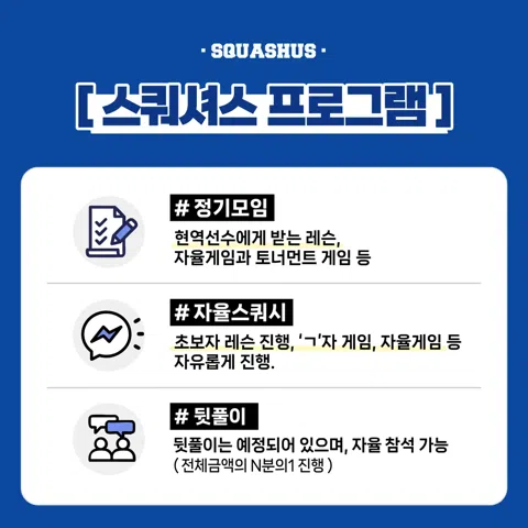 ✨SQUASHUS✨ 안녕하세요! 국내 유일 스쿼시 프로 선수들과 함께하는 스쿼시 커뮤니티 스쿼셔스입니다! SQUASH + US 스쿼시를 널리 알리는 그날까지! 누구나 손쉽게 스쿼시를 접하고 즐길 수 있는 문화를 함께 만들어요 ☺ 🔥🔥🔥필독🔥🔥🔥 1. 스쿼시 일정 및 참여 방법은 꼭 공지를 확인해 주세요! 2. 프로필 이름은 꼭 실명(성+이름)으로 해주세요! 3. 공지 사항의 가입 인사 양식에 맞춰 작성해 주세요! 4. 단체 톡방에 가입해 주세요! 스쿼셔스 송파구 (지점을 꼭 확인해 주세요!) ○ 정모 : 첫째 주 일요일 14시 ~ 17시 ● 장소 : 스마일 스쿼시 송파구 문정동 642 테라타워2 지하 1층 ○ 비용 : 20,000원 (게스트+5,000원) ✔스쿼셔스 공식 인스타그램 @squshus_official 스쿼셔스의 다양한 소식들을 놓치지 말고 받아보세요✨ 90 ~ 05년생 대상으로 운영되고 있는 점 참고 부탁드립니다☺ ✅분당 칼로리 소모량 1등 스포츠 스쿼시! ✅초급, 중급 무료 레슨 진행! ✅무료 장비 대여! * 스쿼셔스와 무관한 홍보글 작성시 경고없이 강퇴합니다.