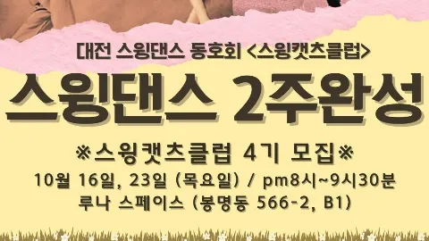 대전.세종 스윙댄스 동호회 <스윙캣츠클럽> 🎵Fly Me To The Moon🎵Sing Sing Sing 신나고 감미로운 스윙재즈 음악에 몸을 맡기고 춤추는'라라랜드'의 주인공이 되어 보고 싶지 않나요? 스윙댄스도 배우고 다양한 사람들과 즐거운 시간을 함께 할 수 있는 스윙캣츠클럽에 당신을 초대합니다🩷 ✅️퇴근 후 평일 심심한 사람 ✅️건강한 취미 / 건전한 모임 ✅️다양한 사람들과 만남 ✅️이색 데이트, 부부취미, 커플취미 ✅️재즈음악이 좋은 사람 ✅️춤에 관심 있어요 스윙댄스 초보를 위한 입문반 '스윙캣츠클럽 4기' 모집 🎀신청링크 : https://forms.gle/MjUWo2iD8tZ8czRUA 💡일시 : 2025년10월16일 스윙캣츠4기 시작! (자세한 일정은 ⬆️ 신청링크 클릭!!) 💡장소 : 루나스페이스 (대전시 유성구 봉명동 566-2 지하1층) 💡준비물 : 편안한 복장, 실내용 신발 (운동화 및 단화) 🎀 문의 : 카카오톡 오픈채팅 [스윙캣츠클럽] 대전세종 스윙댄스
