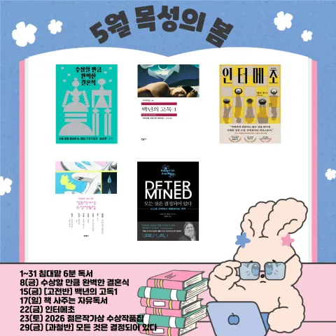 목성의 봄은 산뜻하고 깊이 있는 지적 교류를 지향하는 독서 공동체입니다. 책을 읽고 함께 사유하며 2017년부터 모임을 이어오고 있습니다. 📚 모임 일정 - 지정 독서 : 매달 첫째주, 셋째주 금요일 7시 30분 - 자유 독서 : 매달 둘째주 일요일 11시 (가져온 책 1시간 읽고 1시간 대화) - 문화 디깅 : 매달 넷째주 일요일 (시, 글쓰기, 영화, 전시, 필사 등) - 비정기 모임 : 주말, 평일 등 📚 회원 확인사항 - 가입 후 자기소개 작성 후 게시판 공지 확인 - 가입 1개월 내에 모임 1회 이상 참석 권장 - 참가 신청 시 하단 목록에서 참석을 눌러 대화방에 입장 및 참가비(3000원) 입금 - 당일 취소 3회 이상 강퇴 - 모임 무단 불참(노쇼) 시 즉각 강퇴