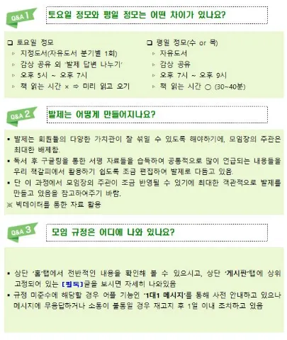 🏷 26년의 독서는 책갈피와 함께🧡 책을 통해 생각을 나누고 삶의 지혜를 배우는 모임입니다 📢 "꾸준히" 참석해주실 수 있는 분 🔖(월 1회 이상)💡 찾아주시면 좋겠습니다💚 🎀책갈피와 함께하는 날 - 토요정모 오전11시 / 오후5시📕 - 평일(수or목)정모 오후7시📔 🎀정모 진행 방식 - 문학/비문학을 나눠 진행합니다 - 책에 대해 서로의 생각을 나눕니다 - 책을 읽고 주어진 발제를 통해 서로 소통합니다 🎀도서 선정 - 회원분들의 추천으로 선정됩니다. 📚 책갈피는 우리 모두가 주인공인 문화를 지향합니다. 올바른 가치관과 좋은 사람들이 모여 같은 취미를 나눌 수 있는 곳입니다 뒷풀이는 자유입니다😄 * 저희는 가입비나 기타 운영비를 받지 않습니다. (대관비만 받고 있어요) 2030 직장인으로 꾸려진 모임! 책갈피 시작 2022. 11. 12. 💔 가입 후 1시간 이내 가입인사 미작성시 기본적인 참여조차 하지 않겠다는 것으로 판단하여 강퇴입니다 😡 종교나 기타 홍보(보험, 사기)등의 목적으로 오시는 분들은 여과없이 강퇴입니다 ✨️독서모임은 책갈피로 충분하실 수 있길😄 🚫 강퇴 규정 🚫 - 타 독서모임 운영진에 한하여 강퇴