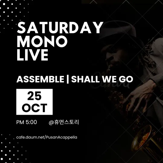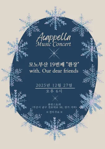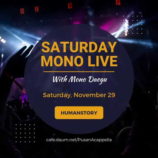 안녕하세요. "모두 모여 노래하자" 라는 뜻의 모노부산은 2003년 10월부터 현재까지 20년이 훌쩍 지난 시간동안 함께 노래하고 있습니다. 아카펠라에 관심이 있으신 분, 아카펠라가 궁금하신 분, 함께하는 노래에 매력을 느끼고 싶으신 분 모두모두 모이세요~ 함께 노래해요😊 ※신입회원분은 간단한 소개와 함께 가입인사글을 꼭 남겨주시기 바랍니다. 정기모임 : 매주 금요일 8시, 휴먼스토리 (부산시 남구 문현동 소재) 공식카페 : cafe.daum.net/PusanAcappella (네이버카페 개설중) 유튜브채널 : https://youtube.com/@monobusan6476?si=eLk8MYzAurxHKQOt