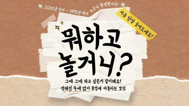 (남성 임시 마감) 🎐26.01.23🎐 🔹️뭐하고 놀거니?🤷♂️🔹️ (부제: 안 놀면 손해임) ✨️오늘도 하루 끝 ▪️나 오늘 뭐했지? ▪️내일 뭐하지? ▪️주말에 뭐하지? ✔️퇴근 후 혼자 누워서 폰만 보다 하루 끝내기 아쉬운 사람들 ✔️뭐라도 하고 싶은데 같이 할 사람이 없는 사람들 다 여기로 모이세요! 🧘♂️그날 기분 따라 🌈날씨 따라 👨👩👧👧사람들 따라 🎯하고 싶은 거 하면서 노는 모임입니다 🖼산책하다가 🎽러닝 될 수도 있음 🎾배드민턴 치다 🎳볼링으로 갈 수도 있음 🫂모집 대상 🔹️91년생 ~ 01년생 (빠른x) 🔹️집에만 있으면 죄책감 드는 분 🔹️"일단 나가면 재밌겠지" 마인드 있으신분 🔹️"뭐라도 하고 싶다" 는 마음 있는분 🔸️기혼,돌싱,타 모임장 및 운영진 🔸️여미새,남미새,여왕벌 🔸️심한 주사,영업 활동 🔸️기본적인 예의 없는분 🔸️이런 분들은 정중히 사양 합니다🙏🙇♂️ 📌 가입후 2시간 이내 가입인사 작성. 📌 월 1회 참여.