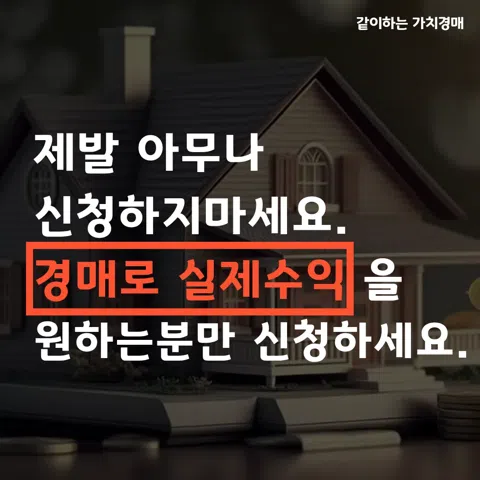 부동산 경매를 처음 접했을 때 저는 가장 먼저 이런 생각이 들었습니다. “이걸… 내가 해도 되는 걸까?” 주변에는 ✔ 이미 잘하는 사람들 이야기만 있고 ✔ 단기간에 돈 벌었다는 말들만 넘쳐나고 ✔ 정작 처음 시작하는 사람의 이야기는 잘 보이지 않았습니다. 그래서 같이하는 가치경매는 ‘잘하는 사람들만을 위한 공간’이 아니라 이제 시작하려는 사람, 아직 헷갈리는 사람을 기준으로 만들어졌습니다. 왜 ‘같이하는’ 가치경매인가요? 경매는 혼자 하면 불안하고, 너무 빠르면 위험해지고, 너무 늦으면 기회를 놓치기 쉽습니다. 그래서 우리는 ✔ 혼자 두지 않고 ✔ 조급하게 몰아가지 않고 ✔ 대신 꾸준히, 현실적으로 함께 봅니다. 빠르게 결과를 약속하지 않습니다. 하지만 방향이 틀리지 않도록 옆에서 같이 걷습니다.