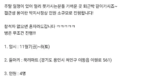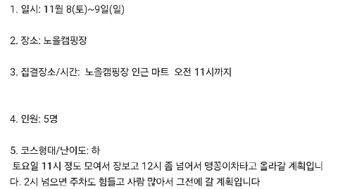🏕 하이킹/트래킹/백패킹/브롬핑/캠핑... 고난스런 여행이라도 즐겁게 여행해요^0^ 😄 초보자 환영 😅 연령제한 75~95년생 😭 기혼 가입불가 🤭 가입인사 24시간내 작성 😐 🐓 chi go LNT 😎 미활동시 정리대상 👉 모임 리딩과 참석 👈 ✔️홈 정모만들기는 운영진이 작성하겠습니다. - 모임은 양식에 맞춰 게시판(관심사 공유)작성 - 신입은 마감시 "대기"로 올려주세요(리딩자 재량. 우선권 부여) ✔️백패킹 참석댓글은 게시 후 익일 10시부터 작성(다수 확인 후 참석) ✔️게시판 "관심사공유"로 검색하면 모임만 보실수 있습니다 ✔️첫 오프 참석 후 리딩가능 / 회칙 한번 읽어봐주시는 센스~ 10/25~26 금산 진악산(동엽) 10/25~26 가평 프다&캠핑(쿠효) 10/27 인덕원역 먹벙(지은) 10/31~11/2 영남알프스 환종주(지행) 11/1~2 홍성 죽도(정민기) 11/1~2 양평 브롬핑(최그림, 윤브로) 11/7~8 시궁산(동엽) 11/8~9 보령 녹도 낚시&백패킹 (이철재) 11/8~9 노을캠핑장(신태우)☆☆ 첫 리딩 감사^^