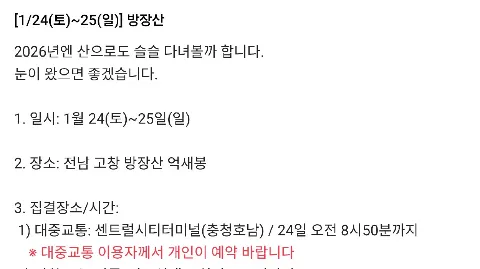 🏕 하이킹/트래킹/백패킹/브롬핑/캠핑... 고난스런 여행이라도 즐겁게 여행해요^0^ 😄 오픈챗방(검색:고난크루) 코드 9090 😅 연령제한 75~95년생 😭 기혼 가입불가 🤭 가입인사 24시간내 작성 😐 🐓 chi go LNT 😎 미활동시 정리대상 👉 모임 리딩과 참석 👈 ✔️홈 정모만들기는 운영진이 작성하겠습니다. - 모임은 양식에 맞춰 게시판(관심사 공유)작성 - 신입은 마감시 "대기"로 올려주세요(리딩자 재량. 우선권 부여) ✔️백패킹 참석댓글은 게시 후 익일 10시부터 작성(다수 확인 후 참석) ✔️게시판 "관심사공유"로 검색하면 모임만 보실수 있습니다 ✔️첫 오프 참석 후 리딩가능 / 회칙 한번 읽어봐주시는 센스~ 1월 9일(금) 신년회(참석여부 달아주세요) 1/10~11 양양 해변캠핑(숀이) 1/11 옥스팜 트레일워커 신청마감(감지) 1/17~18 태기산(해용) 1/24~25 방장산(이철재) 1/31~2/1 소황병산(정민기) 3/5~8 제주 봄캠핑(이동훈)