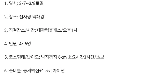 🏕 하이킹/트래킹/백패킹/브롬핑/캠핑... 고난스런 여행이라도 즐겁게 여행해요^0^ 😄 오픈챗방(검색:고난크루) 코드 9090 😅 연령제한 75~95년생 😭 기혼 가입불가 🤭 가입인사 24시간내 작성 😐 🐓 chi go LNT 😎 미활동시 정리대상 👉 모임 리딩과 참석 👈 ✔️홈 정모만들기는 운영진이 작성하겠습니다. - 모임은 양식에 맞춰 게시판(관심사 공유)작성 - 신입은 마감시 "대기"로 올려주세요(리딩자 재량. 우선권 부여) ✔️백패킹 참석댓글은 게시 후 익일 10시부터 작성(다수 확인 후 참석) ✔️게시판 "관심사공유"로 검색하면 모임만 보실수 있습니다 ✔️첫 오프 참석 후 리딩가능 / 회칙 한번 읽어봐주시는 센스~ 3/7 양재~청계산(감지) 3/7~8 선자령(해용) 3/5~8 제주 봄캠핑(이동훈) 3/20~21 퇴근박(이지인)☆비화식☆ 5/1~5 함안/거제/통영 (단미, 즈킁유랑)♡♡첫리딩 감사♡♡ 5/17~18 옥스팜 트레일워커(감지) 6/16~20 일본 훗카이도(꾸준히, 마승)