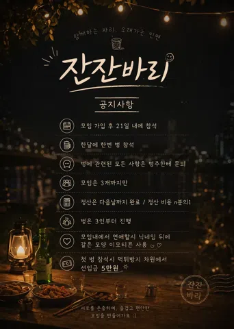 🍺 잔잔바리 | 편하게 모여 오래 가는 사람들 시끄럽고 부담스러운 모임 말고, 편하게 한잔하면서 자연스럽게 친해지는 곳. “잔잔하게 시작해서 오래 가는 인연” 이게 우리 모임의 방향이에요. ✔️ 부담 없는 술자리 ✔ 맛집 탐방 & 가벼운 취미 ✔ 억지 텐션 NO, 자연스러운 분위기 ✔ 서로 예의 지키는 편안한 사람들 🥰88-98년생 남녀 가입가능해요(빠른x) 😘부산거주자, 미혼 가입가능해요 ❌기혼, 주사, 결이 안맞는 분은 안되요 ❌타모임 운영진도 안되요 💥탈퇴 시 재가입 불가입니다 잔잔바리에서 같이 모임해봐요 🙂