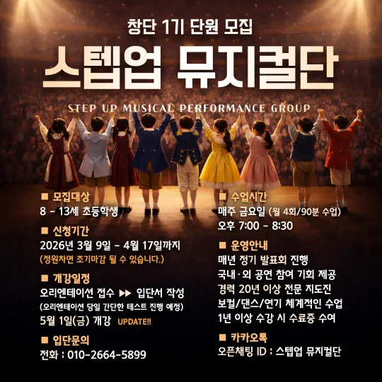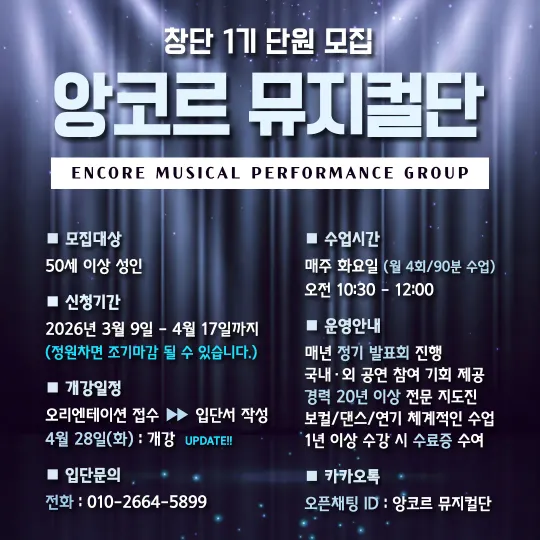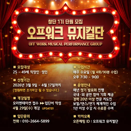 문의하기 👉 https://skartunion.carrd.co 유튜브 https://youtube.com/@s_kunion?si=Q3UEyja1zGPcv3fN 인스타 https://www.instagram.com/sk_artunion?igsh=bThoNmR4djF5bG8= 노래, 연기, 안무를 함께 배우며 뮤지컬 공연까지 도전하는 모임입니다. 뮤지컬을 좋아하지만 도전할 기회가 없었던 이들을 위해 편안한 분위기에서 함께 만들어가는 뮤지컬 프로젝트입니다. ✔ 노래 · 연기 · 안무 기초 ✔ 정기 연습 진행 ✔ 공연 프로젝트 목표 뮤지컬을 좋아하는 분이라면 경험이 없어도 환영합니다.