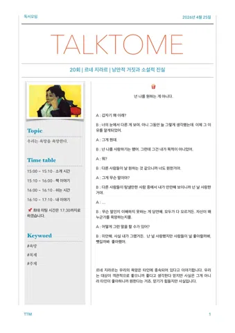 책을 읽고, 영화를 보고 무슨 생각을 하셨나요? 당신의 이야기는 누군가에게 힘이 됩니다. 🧸 모임장 드라마와 영화를 만들었다. 📌 out line · 매주 토요일 혹은 일요일 · 2~3시간 · 성별·연령 제한 없음 · 모임 1주 전 발제문 공유