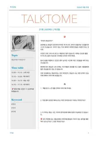 매주 독서모임을 합니다. 다양한 분야의 전문가들과 함께 합니다. 현재 소