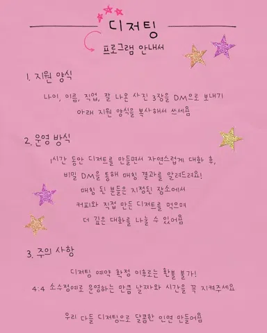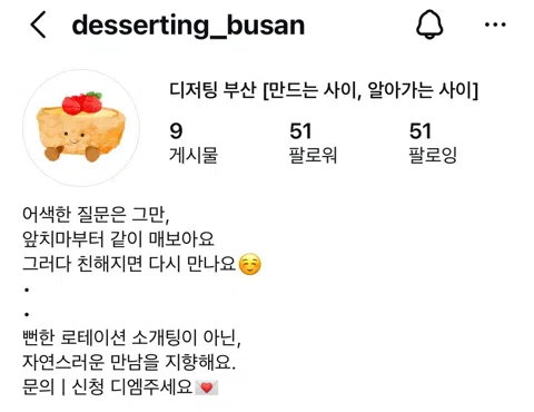 달콤한 소개팅, 디저팅🍰💗 함께 디저트를 만들며 자연스럽게 이야기하고, 그 안에서 서로를 알아가는 시간! 매칭된 분들과는 지정된 장소에서 직접 만든 디저트와 커피를 곁들여 더 깊은 대화를 이어갈 수 있어요🤍 참여를 원한다면 안내된 양식 그대로 DM으로 보내주세요📩 인스타 @desserting_busan 소모임 DM도 가능합니다🤍