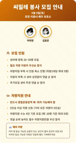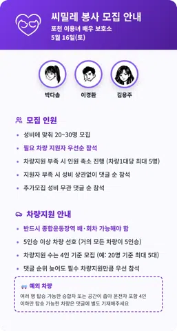유기견 봉사 모임 ‘씨밀레’ 입니다 🐾 같은 시간, 같은 공간에서 아이들과 함께 시간을 나누는 봉사 모임입니다 💛 씨밀레는 ‘영원한 친구’라는 뜻처럼 잠깐이 아닌 오래 이어지는 봉사를 지향합니다. 현재 포천 보호소에서 활동하고 있으며 소형견·대형견과 고양이 친구들이 함께 지내고 있습니다. 이곳의 아이들은 케이지에 갇혀 있기보다 사람과 같은 공간에서 자유롭게 어울리며 생활합니다. ✨ 씨밀레 운영 방식 • 봉사에 필요한 기본 물품은 운영진이 준비합니다 (식대, 방진복, 장화, 장갑, 등) • 사용 내역은 투명하게 공유합니다 • 공지방 / 친목방을 분리해 운영합니다 ✔ 동물을 좋아하고 부담 없이 봉사하고 싶은 분 ✔ 혼자 가는 봉사가 조금 부담스러웠던 분 ✔ 이미 다른 봉사 활동을 하고 계신 분들도 편하게 함께하실 수 있습니다 우리는 누군가와 경쟁하지 않고 누구도 깎아내리지 않습니다. 각자의 방식으로 하는 봉사를 존중 합니다. (영업·다단계·종교 전도는 받지 않습니다) 📌 가입 안내 • 가입 후 24시간 이내 가입인사 작성 • 85~02년생 가입 가능 📸 Instagram simile_volunteerwork 따뜻한 마음이면 충분합니다. 씨밀레에서, 천천히 함께해요🍀