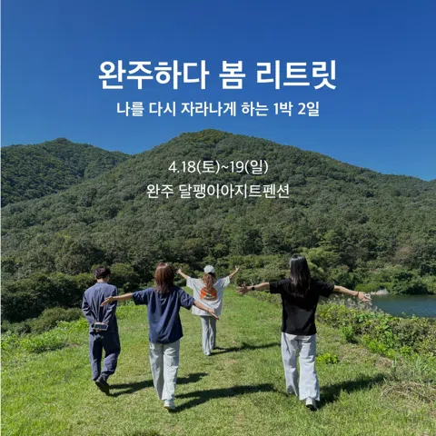 나의 방향으로 삶을 완주하고 싶은 사람들의 모임, 완주하다입니다🌱 완주하다는 매일 작은 성취를 쌓아 무엇이든 해낼 수 있는 힘을 길러보는 챌린지 모임, 한달을 돌아보고 함께 나누며 인사이트를 교환하는 월간 회고모임, 하루를 함께 보내며 나의 인생을 설계하고 그려보는 1박2일 모임을 진행 중입니다. 💚챌린지 모임 몸•마음•의식을 돌보는 매일의 미션 수행 ~4.12 모집 완료 및 온라인 오티 진행 💚1박2일 리트릿 목표설정/방향점검/힐링/나눔/성장 4.18-19/ 완주 달팽이아지트펜션 💚월간 회고모임 한달을 돌아보고 다음 달을 준비하는 모임 매달 마지막주 일요일 오후 5시/ 전주 지향집 2026년, 나에게 터닝 포인트를 만들고 싶다면 함께 완주해요🤗